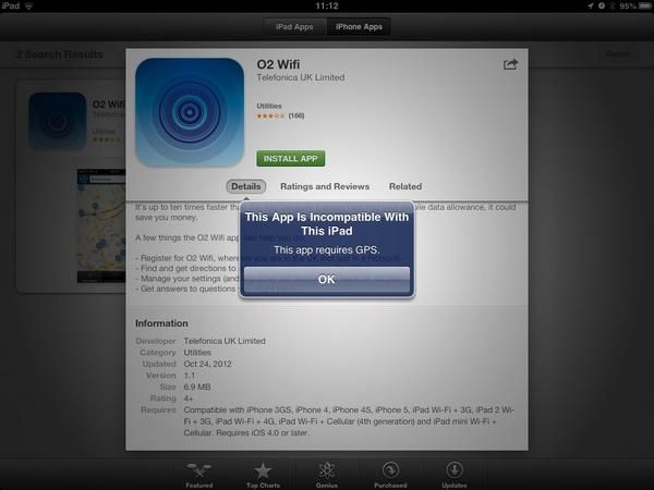 can't install the O2 wifi app on a wifi-only iPad it seems