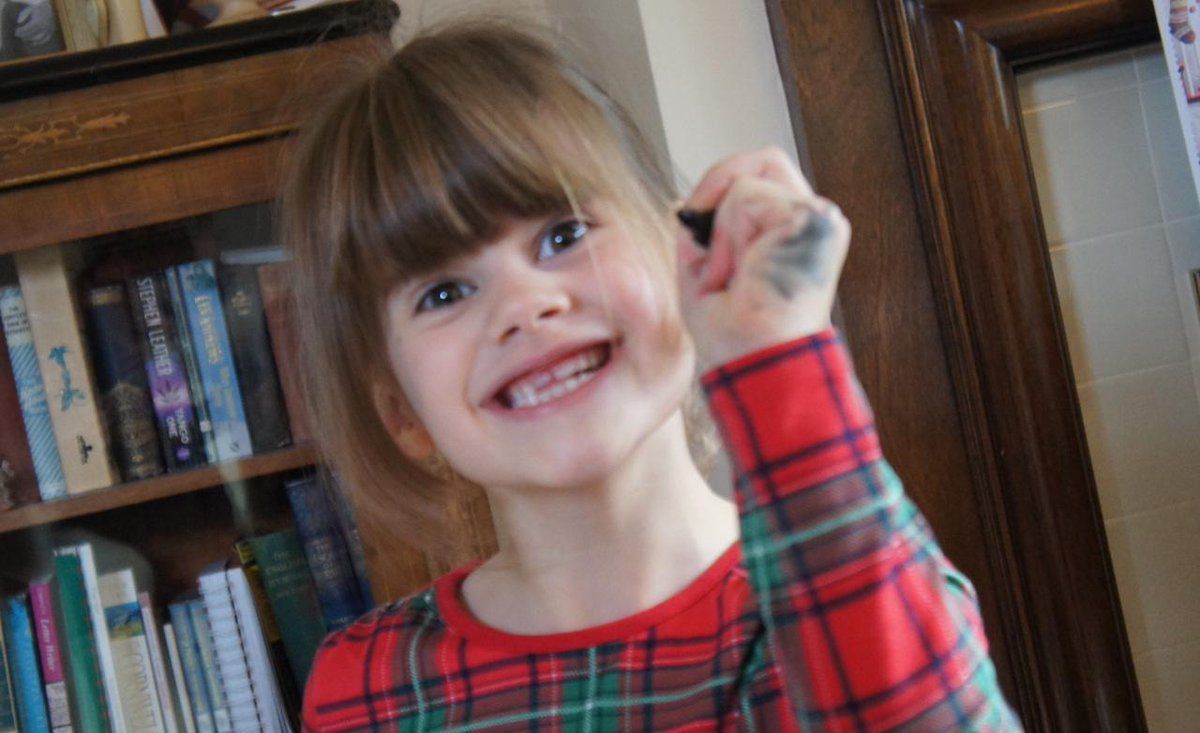 The curse of the left-handed child: Permanently with a inky splodge along the side of her left hand :-)
